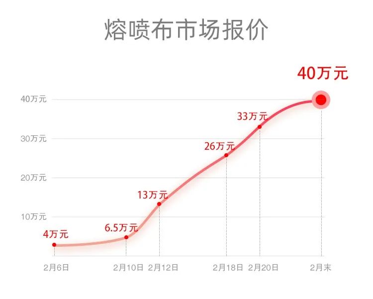 作為醫(yī)用口罩中過濾病菌的重要原材料,新冠疫情的爆發(fā),讓熔噴布成為了比口罩更緊缺的“備戰(zhàn)物資”。市場售價從最初的1.8萬元/噸,攀升到最近的40萬元/噸。